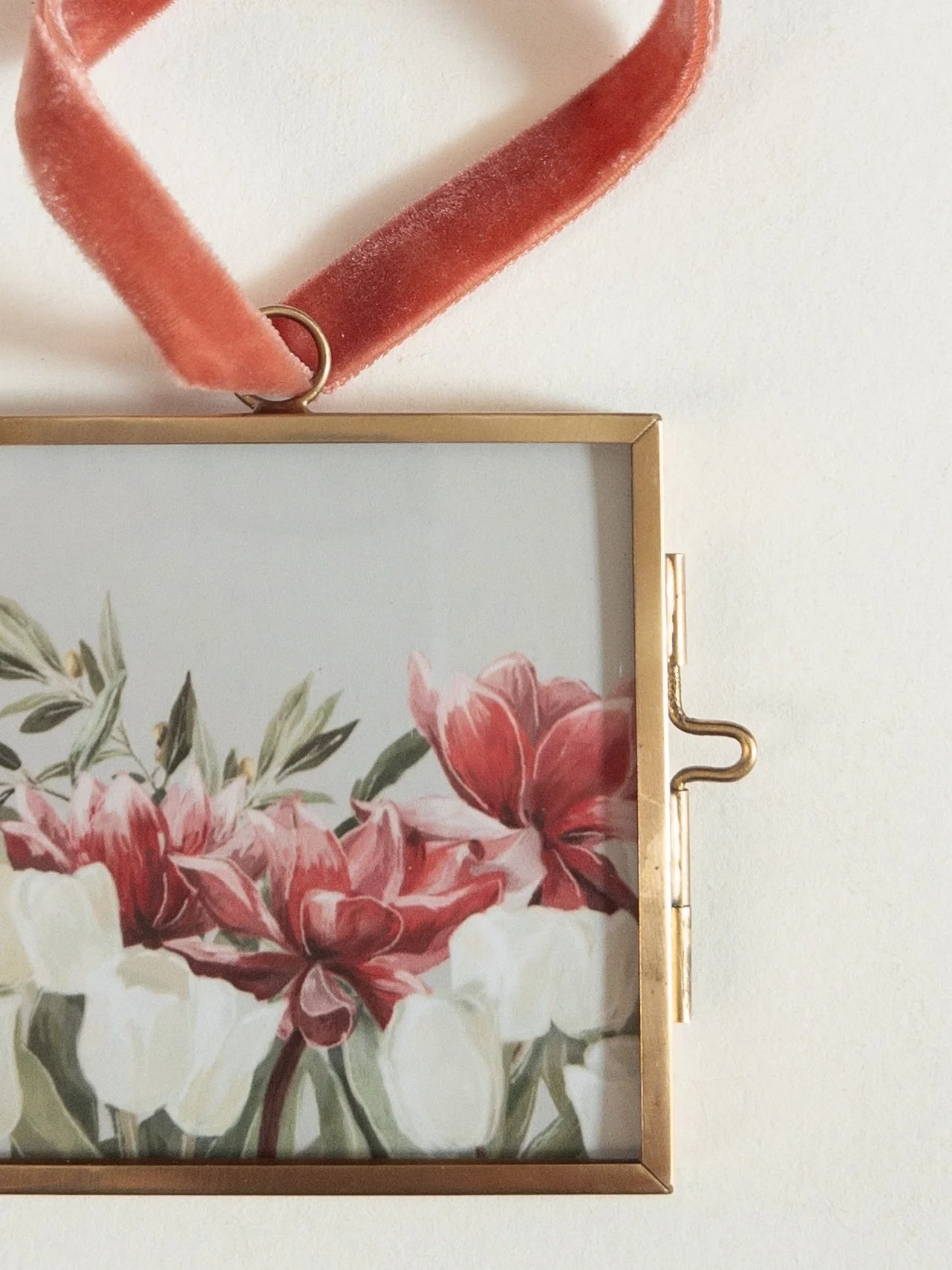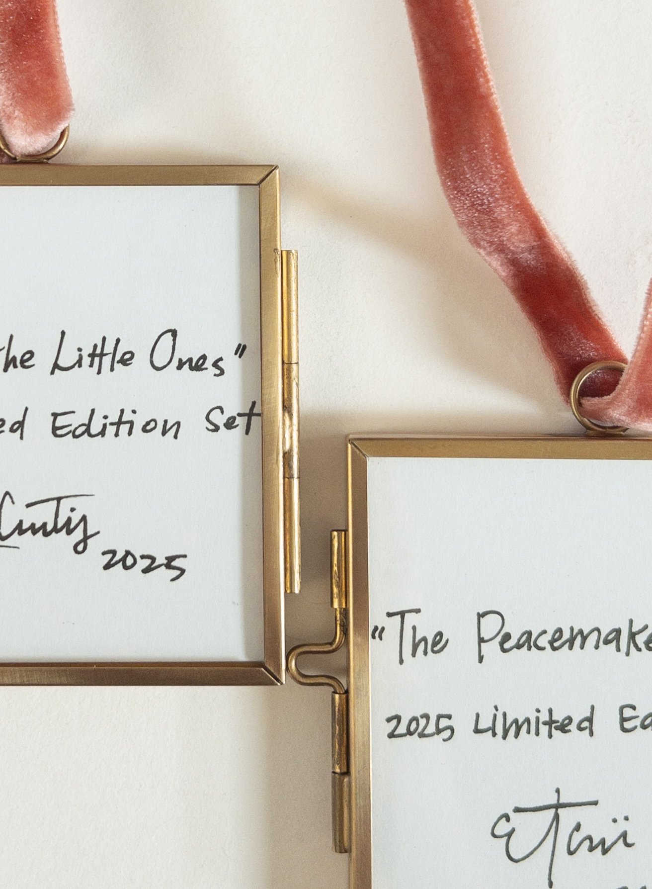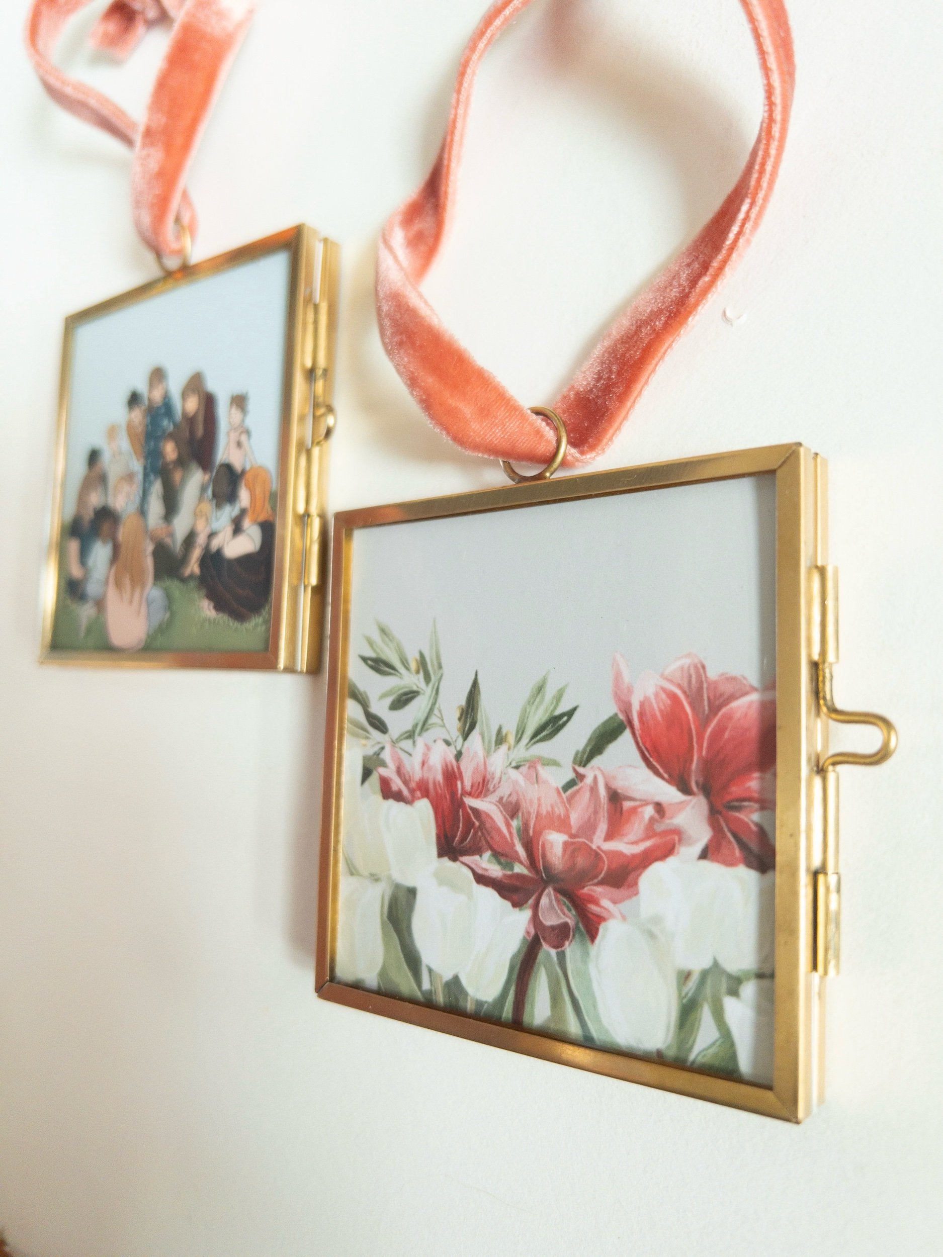 Two locket framed ornaments featuring “Behold the Little Ones” and “The Peacemaker’s Garden.”
